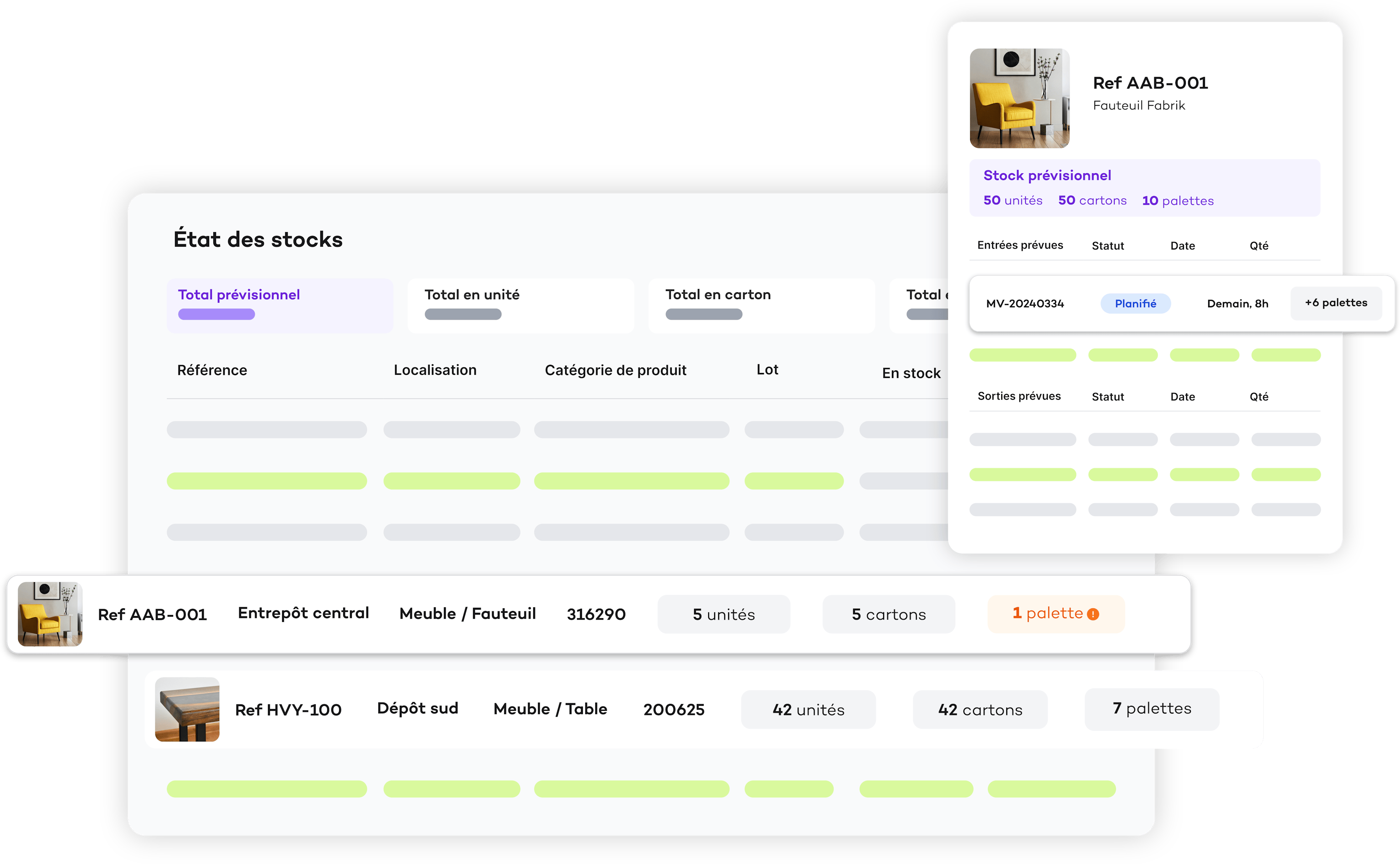 Visualisez vos stocks actuels et prévisionnels quel que soit l'entrepôt (interne ou externe).